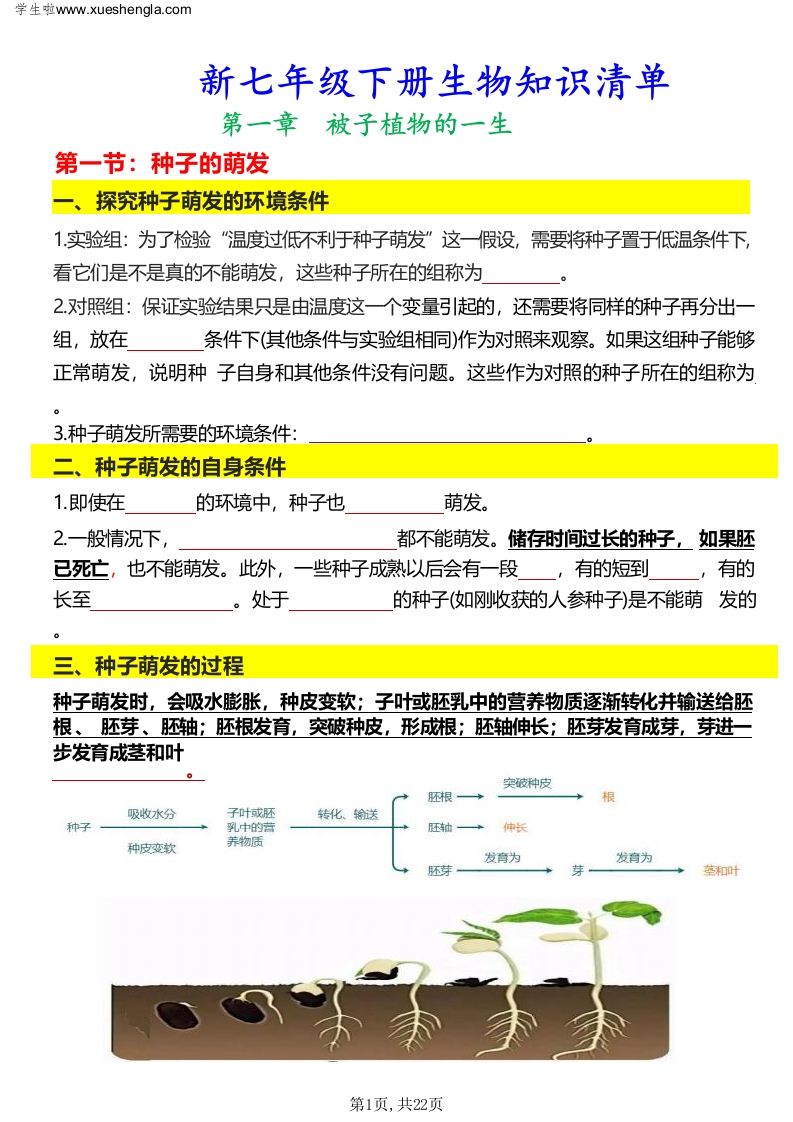 学生啦:学生啦www.xueshengla.com新七年级下册生物知识清单第一章被子植物的一生第一节:种子的萌发一、探究种子萌发的环境条件1.实验组:为了检验“温度过低不利于种子萌发”这一假设,需要将种子置于低温条件下,看它们是不是真的不能萌发,这些种子所在的组称为2对照组:保证实验结果只是由温度这一个变量引起的,还需要将同样的种子再分出一组,放在条件下(其他条件与实验组相同)作为对照来观察。如果这组种子能够正常萌发,说明种子自身和其他条件没有问题。这些作为对照的种子所在的组称为3.种子萌发所需要的环境条件:二、种子萌发的自身条件1.即使在的环境中,种子也萌发。2.一般情况下,都不能萌发。储存时间过长的种子,如果胚已死亡,也不能萌发。此外,一些种子成熟以后会有一段,有的短到,有的长至处于的种子(如刚收获的人参种子)是不能萌发的三、种子萌发的过程种子萌发时,会吸水膨胀,种皮变软;子叶或胚乳中的营养物质逐渐转化并输送给胚根、胚芽、胚轴;胚根发育,突破种皮,形成根;胚轴伸长;胚芽发育成芽,芽进一步发育成茎和叶吸收水分转化、输送种子乳中的营伸长种皮变软养物质发育为发育为胚芽第1页,共22页