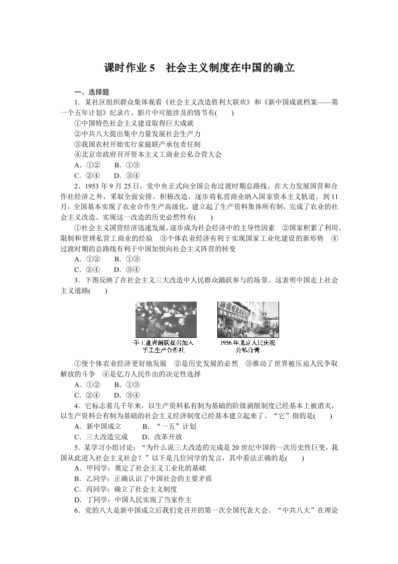学生啦:课时作业5社会主义制度在中国的确立一、选择题1.某社区组织群众集体观看《社会主义改造胜利大联欢》和《新中国成就档案一第一个五年计划》纪录片。影片中可能涉及的情节有()①中国特色社会主义建设取得巨大成就②中共八大提出集中力量发展社会生产力③我国农村开始实行家庭联产承包责任制④北京市政府召开资本主义工商业公私合营大会A.①②B.①③C.②④D.③④2.1953年9月25日,党中央正式向全国公布过渡时期总路线。在大力发展国营和合作社经济之外,采取全面安排,积极改造,逐步将私营商业纳入国家资本主义轨道。到11月,全国基本实现了农业合作生产高级化,建立起了生产资料集体所有制,完成了农业的社会主义改造。实现这一改造的历史必然性有()①社会主义国营经济迅速发展,逐步成为社会经济中的主导性因素②国家积累了利用、限制和管理私营工商业的经验③个体农业经济有利于实现国家工业化建设的新形势④过渡时期的总路线有利于中国加快向社会主义阵营的转变A.①②B.①③C.②④D.③④3.下图反映了在社会主义三大改造中人民群众踊跃参与的场景。这表明中国走上社会主义道路()①使个体农业经济更好地发展②是历史发展的必然③推动了世界被压迫人民争取解放的斗争④是亿万人民作出的决定性选择A.①②B.①③C.②④D.③④4.它标志着几千年来,以生产资料私有制为基础的阶级剥削制度己经基本上被消灭,以生产资料公有制为基础的社会主义经济制度己经基本建立起来了。“它”指的是()A.新中国成立B.“一五”计划C.三大改造完成D.改革开放5.某学习小组讨论:“为什么说三大改造的完成是20世纪中国的一次历史性巨变,我国从此进入社会主义社会?”以下是几位同学的发言,其中看法正确的是()A.甲同学:莫定了社会主义工业化的基础B.乙同学:正确认识了中国社会的主要矛盾C.丙同学:确立了社会主义制度D.丁同学:中国人民实现了当家作主6.党的八大是新中国成立后我们党召开的第一次全国代表大会。“中共八大”在理论