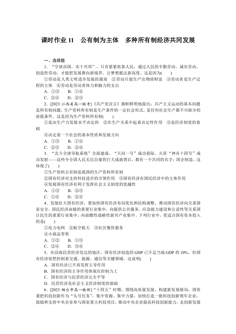 学生啦:课时作业11公有制为主体多种所有制经济共同发展一、选择题1.“空谈误国,实干兴邦”。只有紧紧依靠人民,通过人民的辛勤劳动、诚实劳动、创造性劳动,才能把发展推向新境界、让梦想抵达新高度。这是因为(①劳动是人类文明进步发展的源泉②劳动只能生产出物质财富③劳动者是生产过程的主体④劳动是劳动者体力和脑力的支出A.①③B.①④C.②④D.②③2.[2023江西省高一联考]《共产党宣言》旗帜鲜明地提出:共产主义运动的基本问题是所有制问题。生产资料所有制是生产条件的一定社会形式,是任何社会生产都不可缺少的前提条件。这是因为生产资料所有制()①是由生产力发展水平决定的②在生产关系中起着决定性作用③是经济制度的基础④决定着一个社会的基本性质和发展方向A.①③B.①④C.②③D.②④3.“北斗全球导航系统”全面建成、“天问一号”成功着陆、火星“神舟十四号”成功发射一这些令全国人民无比自豪的巨大成就背后,都有一个共同的名字:国企制造。这体现了()①生产资料公有制是我国的生产资料所有制②国有经济对支持科技进步的引领作用③国有经济在国民经济中的主体作用④发展国有经济有利于发挥社会主义制度的优越性A.①③B.②③C.①④D.②④4.发展壮大国有经济,要加快国有经济布局优化和结构调整,推动国有经济向关系国家安全、国民经济命脉的重要行业集中,向提供公共服务、应急能力建设和公益性等关系国计民生的重要行业集中,向前瞻性战略性新兴产业集中。下列行业中,更适合国有资本投入的是()①电力电网②航空航天③社区餐饮服务④小商品零售A.①②B.①③C.②④D.③④5.在沿海民营经济发达的地区,国有经济创造的GDP己不足当地GDP的10%。但国有经济依然控制着交通、能源、通信等关键领域。这说明()A.国有经济已不再发挥主导作用B.国有经济的主导作用体现在控制力上C.国有经济与民营经济完全平等D.民营经济是社会主义经济制度的基础6.2023·烟台市高一检测]“十四五”时期,围绕高质量发展、构建新发展格局,国资委把科技创新作为“头号任务”,集中资源、集中力量,加快打造一批科技创新领军企业,鼓励和支持中央企业参与国家重大科技项目,推动中央企业提高科技创新能力,走创新发展