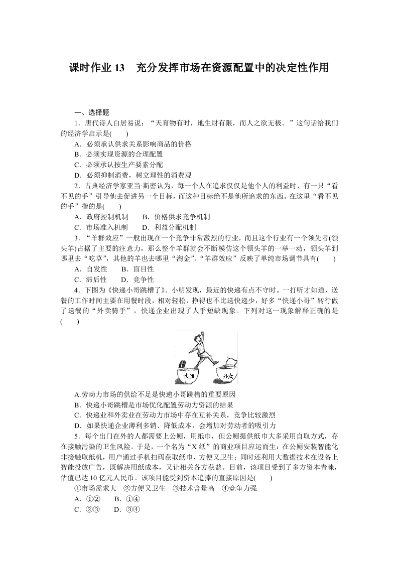学生啦:课时作业13充分发挥市场在资源配置中的决定性作用一、选择题1.唐代诗人白居易说:“天育物有时,地生财有限,而人之欲无极。”这句话给我们的经济学启示是()A.必须承认供求关系影响商品的价格B.必须实现资源的合理配置C.必须承认按生产要素分配D.必须抑制消费,树立理性的消费观2.古典经济学家亚当·斯密认为,每一个人在追求仅仅是他个人的利益时,有一只“看不见的手”引导他去促进另一个目标,而这种目标绝不是他所追求的东西。在这里“看不见的手”指的是()A.政府控制机制B.价格供求竞争机制C.市场准入机制D.利益分配机制3.“羊群效应”一般出现在一个竞争非常激烈的行业,而且这个行业有一个领先者(领头羊)占据了主要的注意力,那么整个羊群就会不断模仿这个领头羊的一举一动,领头羊到哪里去“吃草”,其他的羊也去哪里“淘金”。“羊群效应”反映了单纯市场调节具有()A.自发性B.盲目性C.滞后性D.竞争性4.下图为《快递小哥跳槽了》。小明发现,最近的快递有点不守时。一打听才知道,送餐的工作时间主要在用餐时段,相对轻松,挣得也不比送快递少,好多“快递小哥”转行做了送餐的“外卖骑手”,快递企业出现了人手短缺现象。下列对这一现象解释正确的是()快A.劳动力市场的供给不足是快递小哥跳槽的重要原因B.快递小哥跳槽是市场优化配置劳动力资源的结果C.快递业和外卖业在劳动力市场中存在互补关系,竞争比较激烈D.如果快递企业薄利多销、降低成本,会增加对劳动者的吸引力5.每个出门在外的人都需要上公厕,用纸巾,但公厕提供纸巾大多采用自取方式,存在接触污染的卫生风险。于是,一个名为“X纸”的商业项目应运而生:在公厕安装智能化非接触取纸机,用户通过手机扫码获取纸巾,方便又卫生:同时还利用大数据技术在设备上智能投放广告,既解决用纸成本,又让相关各方获益。目前,该项目受到了多方资本青睐,估值己达10亿元人民币。该项目能受到资本追捧的直接原因是(①市场需求大②方便又卫生③技术含量高④竞争力强A.①②B.①④C.②③D.③④