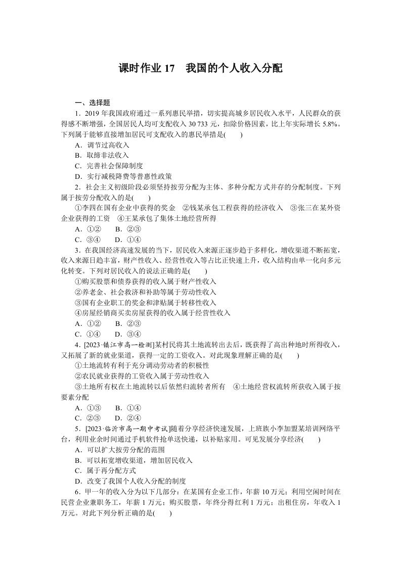 学生啦:课时作业17我国的个人收入分配一、选择题1.2019年我国政府通过一系列惠民举措,切实提高城乡居民收入水平,人民群众的获得感不断增强,全国居民人均可支配收入30733元,扣除价格因素,比上年实际增长5.8%。下列属于能够直接增加居民可支配收入的惠民举措是()A.调节过高收入B.取缔非法收入C.完善社会保障制度D.实行减税降费等普惠性政策2.社会主义初级阶段必须坚持按劳分配为主体、多种分配方式并存的分配制度。下列属于按劳分配收入的是()①李四在国有企业中获得的奖金②钱某承包工程获得的经济收入③张三在某外资企业获得的工资④王某承包了集体土地经营所得A.①X②B.②③C.③④D.①④3.在我国经济高速发展的当下,居民收入来源正逐步趋于多样化,增收渠道不断拓宽,收入来源日趋丰富,财产性收入、经营性收入等占比正快速上升,收入结构由单一化向多元化转变。下列对居民收入的说法正确的是()①购买股票和债券获得的收入属于财产性收入②养老金、社会救济和补助等属于劳动性收入③国有企业职工的奖金和津贴属于转移性收入④房屋经销商买卖房屋获得的收入属于经营性收入A.①②B.②③C.①④D.③④4.[2023·镇江市高一检测]某村民将其土地流转出去后,既获得了高出种地时所得收入,又拓展了新的就业渠道,获得一定的工资收入。对此现象理解正确的是()①土地流转有利于充分调动劳动者的积极性②农民就业获得的工资收入属于劳动性收入③土地所有权在土地流转以后依然归流转者所有④土地经营权流转所获收入属于按要素分配A.①③B.①④C.②③5.[2023·临沂市高一期中考试]随着分享经济快速发展,上班族小李加盟某培训网络平台,利用业余时间通过手机软件抢单送快递,以补贴家用。可见发展分享经济()A.可以扩大按劳分配的范围B.可以拓宽增收渠道,增加居民收入C.属于再分配方式D.改变了我国个人收入分配的制度6.甲一年的收入分为以下几部分:在某国有企业工作,年薪10万元:利用空闲时间在民营企业兼职务工,年薪1万元:购买股票,年终分得红利1万元:出租住房,年收入1万元。对此下列分析正确的是()