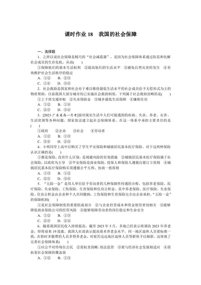 学生啦:课时作业18我国的社会保障一、选择题1.之所以说社会保障是精巧的“社会减震器”,是因为社会保障体系通过防范和化解社会成员的生存危机,从而(①保障他们的基本生活权利②提高他们的生活水平③避免自然灾害的发生④有效维护社会生活秩序的稳定A.①②B.②③C.①④D.③④2.社会救助是国家和社会对于难以维持最低生活水平的社会成员给予无偿形式为主的物质帮助。目前我国大部分城市均己实施社会救助制度,下列属于社会救助范畴的是()①上下班交通补贴②失业保险金③城乡最低生活保障④廉租住房A.①②B.①④C.②③D.③④3.[2023·广东省高一月考]面对现实生活中人们可能遇到的疾病、失业、养老、灾害、生活贫困等各种问题,国家依法建立起社会保障体系。在这一体系中承担主要责任的是①政府②企业③社会④劳动者A.①②C.③④D.②④4.小明同学上高中后购买了学生平安保险和城镇居民基本医疗保险。对于这两种保险认识正确的是()①都是保险,没有什么区别,是规避风险的有效措施②城镇居民基本医疗保险属于社会保险,以政府为主导③平安保险是商业保险,投保人和保险人遵循自愿订立原则④城镇居民基本医疗保险购买须遵循公平互利、协商一致原则A.①③B.①②C.②③D.③④5.“五险一金”是用人单位给予劳动者的几种保障性待遇的合称,包括养老保险、医疗保险、失业保险、工伤保险、生育保险和住房公积金。其中养老保险、医疗保险、失业保险、住房公积金由企业和个人共同缴纳,工伤保险和生育保险完全由企业承担。“五险一金”的保障机制()①是社会保障制度的重要组成部分②与企业经营成本和资金使用密切相关③能够降低商业保险公司的经营风险④能够保障劳动者的岗位稳定和生命安全A.①②B.①③6.随着我国居民收入持续提高,截至2023年5月,多地己经表示将调高2023年养老金,即将迎来19连涨。我国人社部表示提高基本养老金水平,同一地区退休人员要标准一致,在职时多缴费的人员多得养老金,对艰苦边远地区退休人员等群体予以倾斜。这体现了完善社会保障体系()①应公平对待每位公民②需权责清晰,依法监管③要与经济社会发展相适应④需拓宽社会保障的覆盖面A.①②B.①③
