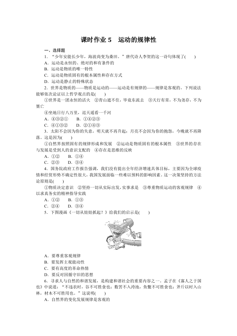 学生啦:课时作业5运动的规律性一、选择题1.“少年安能长少年,海波尚变为桑田。”唐代诗人李贺的这一诗句体现了()A.运动是永恒的、绝对的和有条件的B.运动是物质的唯一特性C.运动是物质固有的根本属性和存在方式D.运动是静止的特殊状态2.世界是物质的—物质是运动的—运动是有规律的—规律是客观的。下列说法能够依次论证以上哲学观点的是()①世界是一团永恒的活火②青山遮不住,毕竞东流去③天行有常,不为尧存,不为桀亡④坐地日行八万里,巡天遥看一千河A.④③②①B.①④②③3,太阳不会因为你的失意,明天就不再升起:月亮不会因为你的抱怨,今晚就不再降落。这是因为(①自然界按照固有的规律形成和发展②运动是物质固有的根本属性③世界的存在与发展是受到人的意识支配的④存在是思维的反映A.①②C.②③D.③④4,国务院政府工作报告强调,我们没有提出全年经济增速具体目标,主要因为全球疫情和经贸形势不确定性很大,我国发展面临一些难以预料的影响因素。这一决策坚持的方法论原则是(①物质决定意识②坚持一切从实际出发,实事求是③尊重物质运动的客观规律④以求真务实的精神指导实践A.①②B.①③C.②④D.③④5.下图漫画《一切从娃娃抓起?》给我们的启示是(A.要尊重客观规律B.要发挥主观能动性C.要有高度的革命热情D.要反对因循守旧的思想6.寻求人与自然的和谐发展,是构建和谐社会的重要内容之一。孟子在《寡人之于国也》中说道:“不违农时,谷不可胜食也:数罟不入湾池,鱼鳖不可胜食也:斧斤以时入山林,材木不可胜用也。”这说明()A.自然界的变化发展规律是客观的