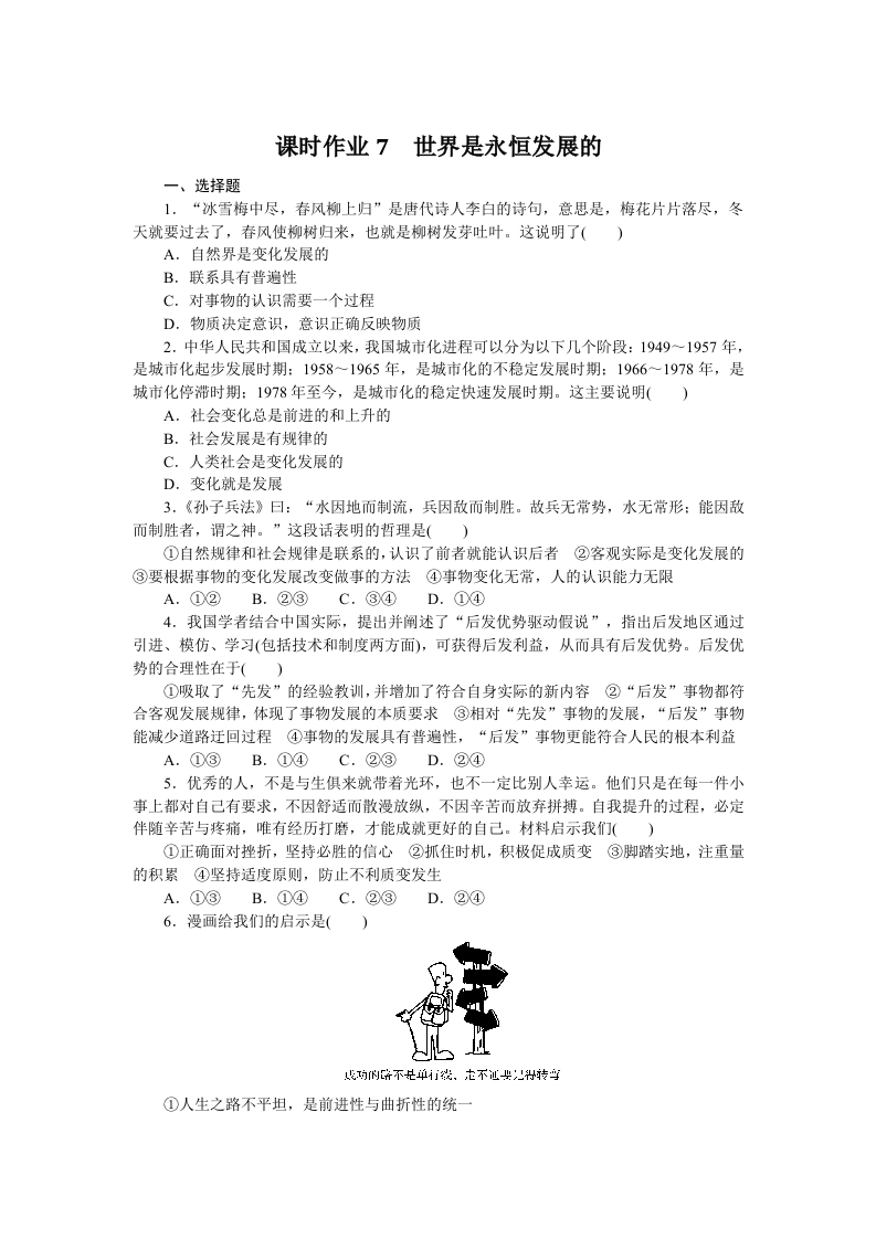 学生啦:课时作业7世界是永恒发展的一、选择题1.“冰雪梅中尽,春风柳上归”是唐代诗人李白的诗句,意思是,梅花片片落尽,冬天就要过去了,春风使柳树归来,也就是柳树发芽吐叶。这说明了()A.自然界是变化发展的B.联系具有普遍性C.对事物的认识需要一个过程D.物质决定意识,意识正确反映物质2.中华人民共和国成立以来,我国城市化进程可以分为以下几个阶段:1949一1957年,是城市化起步发展时期:1958~1965年,是城市化的不稳定发展时期:1966~1978年,是城市化停滞时期:1978年至今,是城市化的稳定快速发展时期。这主要说明()A.社会变化总是前进的和上升的B.社会发展是有规律的C.人类社会是变化发展的D.变化就是发展3.《孙子兵法》曰:“水因地而制流,兵因敌而制胜。故兵无常势,水无常形:能因敌而制胜者,谓之神。”这段话表明的哲理是()①自然规律和社会规律是联系的,认识了前者就能认识后者②客观实际是变化发展的③要根据事物的变化发展改变做事的方法④事物变化无常,人的认识能力无限A.①②B.②③C.③④D.①④4.我国学者结合中国实际,提出并阐述了“后发优势驱动假说”,指出后发地区通过引进、模仿、学习(包括技术和制度两方面),可获得后发利益,从而具有后发优势。后发优势的合理性在于()①吸取了“先发”的经验教训,并增加了符合自身实际的新内容②“后发”事物都符合客观发展规律,体现了事物发展的本质要求③相对“先发”事物的发展,“后发”事物能减少道路迂回过程④事物的发展具有普遍性,“后发”事物更能符合人民的根本利益A.①③B.①④C.②③D.②④5.优秀的人,不是与生俱来就带着光环,也不一定比别人幸运。他们只是在每一件小事上都对自己有要求,不因舒适而散漫放纵,不因辛苦而放弃拼搏。自我提升的过程,必定伴随辛苦与疼痛,唯有经历打磨,才能成就更好的自己。材料启示我们()①正确面对挫折,坚持必胜的信心②抓住时机,积极促成质变③脚踏实地,注重量的积累④坚持适度原则,防止不利质变发生A.①③B.①④C.②③D.②④6.漫画给我们的启示是()①人生之路不平坦,是前进性与曲折性的统一