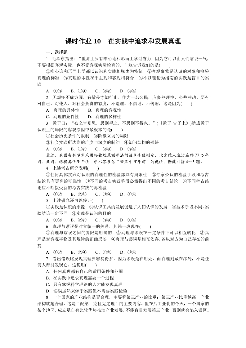 学生啦:课时作业10在实践中追求和发展真理一、选择题1.毛泽东指出:“世界上只有唯心论和形而上学最省力,因为它可以由人们瞎说一气,不要根据客观实际,也不受客观实际检查的。”这告诉我们的是()①唯心论和形而上学都以认识和实践相脱离为特征②客观事物是认识的对象和检验真理的标准③真理的本性在于主观和客观相符合④不以理论为指南的实践是盲目的实践A.①③B.①④C.②③D.②④2.无规矩不成方圆,有敬畏才知行止。作为一名公民,应多些理性,少些冲动。要有对自己、对他人、对社会负责的态度,不造谣、不信谣、不传谣,这是因为()A,真理的具体性B.真理的客观性C.真理的条件性D.真理的多样性3.孟子曰:“心之官则思,思则得之,不思则不得也。”(《孟子告子上》)造成孟子认识上的局限的客观原因中最根本的是()①社会历史条件的限制②阶级立场的局限③社会实践所达到的广度与深度的制约④知识结构的残缺A.①②B.①③C.②④D.③④最近,我回有科学家采用铝被埋藏测年法的技术手段测定,北京猿人生活在约77万年前,此前,根据其他测年法,学术界采信“四五十万年前”的说法。据此回答4一5题。4.上述考古研究表明()①任何具体实践对认识的真理性的检验都具有局限性②专家公认的检验手段和考古结论具有更高的可靠性③不同的考古实践手段必然得出不同的考古结论④不同考古结论应不断接受新的考古实践的再检验A.①②B.②③C.③④D.①④5.上述研究还可以佐证()①实践是认识的来源②认识工具的发展促进了人们认识的发展③技术手段不同,实验结论一定不同④实践是认识的目的A.①②B.②③C.③④D.①④6.真理与谬误是对立统一的关系,其统一表现在()①真理与谬误之间的界限是明确的②真理与谬误在一定条件下可以相互转化③真理是对客观事物及其规律的正确反映④真理与谬误是相互依存,各以对方为自己存在的前提A.①②B.②④C.①③D.③④7.看出错误比发现真理要容易得多,因为谬误是在明处,而真理则藏在深处,不是任何人都能发现它。这说明()A.任何真理都有自己的适用条件和范围B.在实践中追求真理需要一个过程C.只有掌握科学理论的人才能发现真理D.谬误虽然来源于实践但不需要实践检验8.一个国家的产业结构是否合理,主要看第三产业的比重:第三产业比重越高,产业结构就越合理,这是“配第一克拉克定理”的主要内容。但在后工业化的今天,一个国家的某个地区,应立足自身比较优势推动产业发展,不能盲目发展第三产业,否则就会陷入误区。
