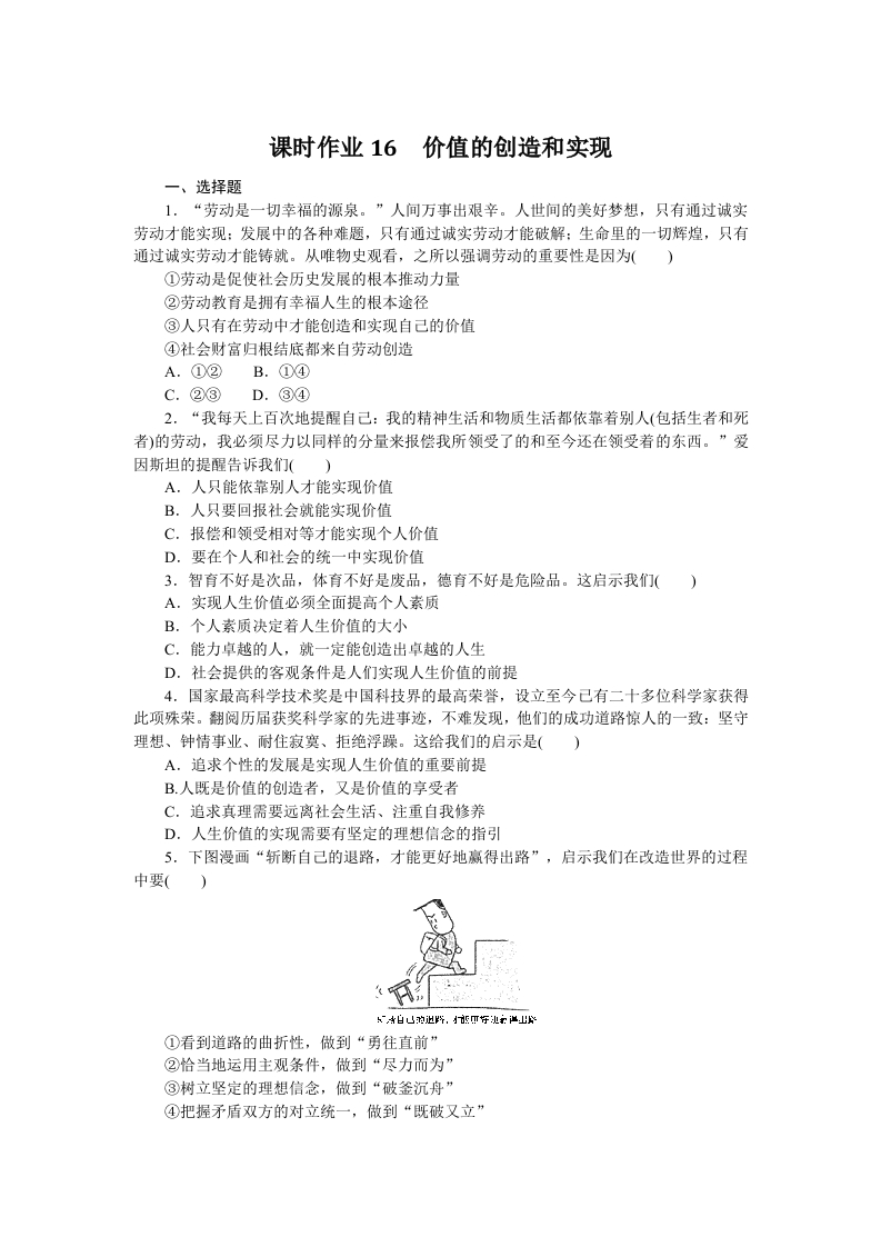 学生啦:课时作业16价值的创造和实现一、选择题1.“劳动是一切幸福的源泉。”人间万事出艰辛。人世间的美好梦想,只有通过诚实劳动才能实现:发展中的各种难题,只有通过诚实劳动才能破解:生命里的一切辉煌,只有通过诚实劳动才能铸就。从唯物史观看,之所以强调劳动的重要性是因为()①劳动是促使社会历史发展的根本推动力量②劳动教育是拥有幸福人生的根本途径③人只有在劳动中才能创造和实现自己的价值④社会财富归根结底都来自劳动创造A.①②B.①④C.②③2.“我每天上百次地提醒自己:我的精神生活和物质生活都依靠着别人(包括生者和死者)的劳动,我必须尽力以同样的分量来报偿我所领受了的和至今还在领受着的东西。”爱因斯坦的提醒告诉我们()A,人只能依靠别人才能实现价值B.人只要回报社会就能实现价值C.报偿和领受相对等才能实现个人价值D.要在个人和社会的统一中实现价值3.智育不好是次品,体育不好是废品,德育不好是危险品。这启示我们()A,实现人生价值必须全面提高个人素质B.个人素质决定着人生价值的大小C.能力卓越的人,就一定能创造出卓越的人生D.社会提供的客观条件是人们实现人生价值的前提4.国家最高科学技术奖是中国科技界的最高荣誉,设立至今已有二十多位科学家获得此项殊荣。翻阅历届获奖科学家的先进事迹,不难发现,他们的成功道路惊人的一致:坚守理想、钟情事业、耐住寂寞、拒绝浮躁。这给我们的启示是()A.追求个性的发展是实现人生价值的重要前提B.人既是价值的创造者,又是价值的享受者C.追求真理需要远离社会生活、注重自我修养D.人生价值的实现需要有坚定的理想信念的指引5.下图漫画“斩断自己的退路,才能更好地赢得出路”,启示我们在改造世界的过程中要()①看到道路的曲折性,做到“勇往直前”②恰当地运用主观条件,做到“尽力而为”③树立坚定的理想信念,做到“破釜沉舟”④把握矛盾双方的对立统一,做到“既破又立”
