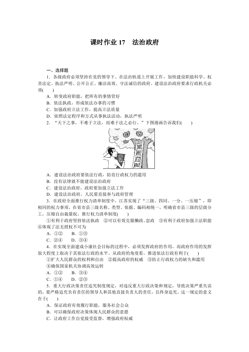 学生啦:课时作业17法治政府一、选择题1.各级政府必须坚持在党的领导下、在法治轨道上开展工作,加快建设职能科学、权责法定、执法严明、公开公正、廉洁高效、守法诚信的政府。建设法治政府要求行政机关必须()A.转变政府职能,把所有的事情管好B.依法执政,形成依法办事的习惯C.加强政府立法工作,提高立法质量D.依照法定程序和方式从事执法活动,执法严明2.“天下之事,不难于立法,而难于法之必行。”下图漫画告诉我们()A.建设法治政府要依法行政,防范行政权力的滥用B.没有法律就不能建设法治政府C.建设法治政府,政府要加强立法工作D.建设法治政府,人民要直接参与政府管理3.在政府全面推行权力清单制度中,江苏实现了“三级、四同、一分、一压缩”,即相同的权力事项,在省市县三级名称、类型、依据、编码相统一,明确省市县三级的层级分工,压缩自由裁量权。推行权力清单制度()①有利于政府坚持依法执政②可以有效克服懒政、怠政③有利于政府加强立法职能④体现了法无授权不可为A.①②B.①③C.②④D.③④4.在实现全面建成小康社会目标的过程中,必须发挥政府的作用,而政府作用的发挥很大程度上取决于其依法行政的水平。从政府的角度看,推进依法行政有利于(①扩大人民群众的权利和自由②提高政府的权威③防止行政权力的缺失和滥用④确保国家机关协调高效运转A.①②B.③④C.①④D.②③5.重大行政决策责任追究制度规定,对违反重大行政决策和规定,导致决策严重失误的,要严格追究负有责任的领导人和其他直接负责人的责任,且终身追究。这一规定的意义A.保证政府有效履行职能,服务社会公众B.可以确保政府决策体现人民群众的意愿C.让政府工作自觉接受监督,增强政府权威