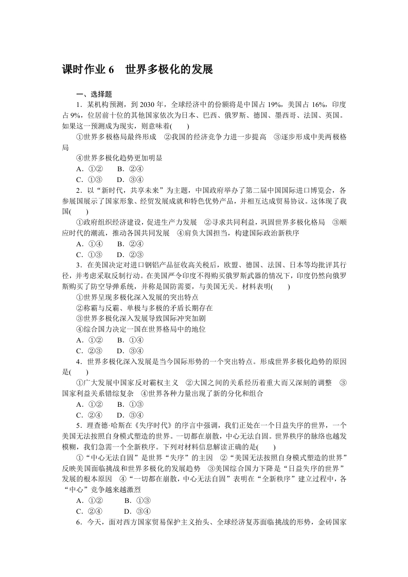 学生啦:课时作业6世界多极化的发展一、选择题1.某机构预测,到2030年,全球经济中的份额将是中国占19%,美国占16%,印度占9%,位居前十位的其他国家依次为日本、巴西、俄罗斯、德国、墨西哥、法国、英国。如果这一预测成为现实,则意味着()①世界多极格局最终形成②我国的经济竞争力进一步提高③逐步形成中美两极格局④世界多极化趋势更加明显A.①②B.②④C.①③D.③④2.以“新时代,共享未来”为主题,中国政府举办了第二届中国国际进口博览会,各参展国展示了国家形象、经贸发展成就和特色优势产品,并相互达成贸易协议。这体现了我国()①政府组织经济建设,促进生产力发展②寻求共同利益,巩固世界多极化格局③顺应时代的潮流,推动各国共同发展④肩负大国担当,构建国际政治新秩序A.①④B.②④C.①③D.②③3.在美国决定对进口钢铝产品征收高关税后,欧盟、德国、法国、日本等均批评其行径,并考虑采取反制行动。在美国严令印度不得购买俄罗斯武器的情况下,印度仍然向俄罗斯购买了防空导弹系统,并称是国防需要,与美国无关。材料表明()①世界呈现多极化深入发展的突出特点②称霸与反霸、单极与多极的矛盾长期存在③世界多极化深入发展导致国际冲突加剧④综合国力决定一国在世界格局中的地位A.①②B.①④C.②③D.③④4.世界多极化深入发展是当今国际形势的一个突出特点。形成世界多极化趋势的原因是()①广大发展中国家反对霸权主义②大国之间的关系经历着重大而又深刻的调整③国家利益关系错综复杂④世界各种力量出现了新的分化和组合A.①②B.①③C.②④D.③④5.理查德哈斯在《失序时代》的序言中强调,我们正处在一个日益失序的世界,一个美国无法按照自身模式塑造的世界。一切都在崩散,中心无法自固。世界秩序的脉络也越发模糊,我们急需一个全新秩序。下列对材料信息解读正确的是()①“中心无法自固”是世界“失序”的主因②“美国无法按照自身模式塑造的世界”反映美国面临挑战和世界多极化的发展趋势③美国综合国力下降是“日益失序的世界”发展的根本原因④“一切都在崩散,中心无法自固”表明在“全新秩序”建立过程中,各“中心”竞争越来越激烈A.①②B.①③C.②④D.③④6.今天,面对西方国家贸易保护主义抬头、全球经济复苏面临挑战的形势,金砖国家
