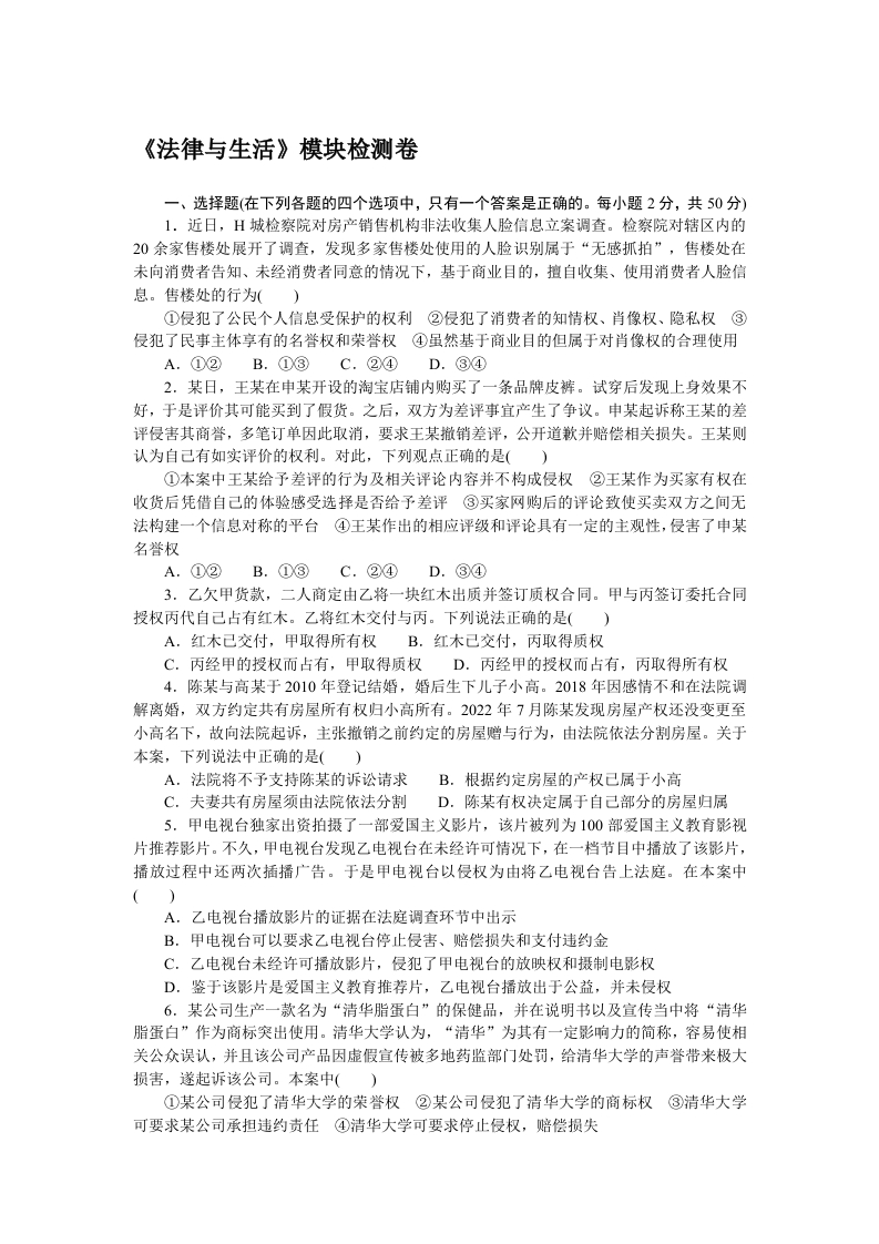 学生啦:《法律与生活》模块检测卷一、选择题(在下列各题的四个选项中,只有一个答案是正确的。每小题2分,共50分)1.近日,H城检察院对房产销售机构非法收集人脸信息立案调查。检察院对辖区内的20余家售楼处展开了调查,发现多家售楼处使用的人脸识别属于“无感抓拍”,售楼处在未向消费者告知、未经消费者同意的情况下,基于商业目的,擅自收集、使用消费者人脸信息。售楼处的行为()①侵犯了公民个人信息受保护的权利②侵犯了消费者的知情权、肖像权、隐私权③侵犯了民事主体享有的名誉权和荣誉权④虽然基于商业目的但属于对肖像权的合理使用A.①②B.①③C.②④D.③④2.某日,王某在申某开设的淘宝店铺内购买了一条品牌皮裤。试穿后发现上身效果不好,于是评价其可能买到了假货。之后,双方为差评事宜产生了争议。申某起诉称王某的差评侵害其商誉,多笔订单因此取消,要求王某撤销差评,公开道歉并赔偿相关损失。王某则认为自己有如实评价的权利。对此,下列观点正确的是()①本案中王某给予差评的行为及相关评论内容并不构成侵权②王某作为买家有权在收货后凭借自己的体验感受选择是否给予差评③买家网购后的评论致使买卖双方之间无法构建一个信总对称的平台④王某作出的相应评级和评论具有一定的主观性,侵害了申某名誉权A.①②B.①③C.②④D.③④3.乙欠甲货款,二人商定由乙将一块红木出质并签订质权合同。甲与丙签订委托合同授权丙代自己占有红木。乙将红木交付与丙。下列说法正确的是()A.红木己交付,甲取得所有权B.红木已交付,丙取得质权C.丙经甲的授权而占有,甲取得质权D.丙经甲的授权而占有,丙取得所有权4.陈某与高某于2010年登记结婚,婚后生下儿子小高。2018年因感情不和在法院调解离婚,双方约定共有房屋所有权归小高所有。2022年7月陈某发现房屋产权还没变更至小高名下,故向法院起诉,主张撒销之前约定的房屋赠与行为,由法院依法分割房屋。关于本案,下列说法中正确的是()A.法院将不予支持陈某的诉讼请求B.根据约定房屋的产权已属于小高C.夫妻共有房屋须由法院依法分割D.陈某有权决定属于自己部分的房屋归属5.甲电视台独家出资拍摄了一部爱国主义影片,该片被列为100部爱国主义教育影视片推荐影片。不久,甲电视台发现乙电视台在未经许可情况下,在一档节目中播放了该影片,播放过程中还两次插播广告。于是甲电视台以侵权为由将乙电视台告上法庭。在本案中A.乙电视台播放影片的证据在法庭调查环节中出示B.甲电视台可以要求乙电视台停止侵害、赔偿损失和支付违约金C.乙电视台未经许可播放影片,侵犯了甲电视台的放映权和摄制电影权D.鉴于该影片是爱国主义教育推荐片,乙电视台播放出于公益,并未侵权6.某公司生产一款名为“清华脂蛋白”的保健品,并在说明书以及宣传当中将“清华脂蛋白”作为商标突出使用。清华大学认为,“清华”为其有一定影响力的简称,容易使相关公众误认,并且该公司产品因虚假宣传被多地药监部门处罚,给清华大学的声誉带来极大损害,遂起诉该公司。本案中()①某公司侵犯了清华大学的荣誉权②某公司侵犯了清华大学的商标权③清华大学可要求某公司承担违约责任④清华大学可要求停止侵权,赔偿损失