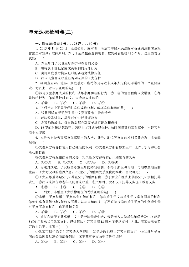 学生啦:单元达标检测卷(二)一、选择题(每题2分,共25题,共50分)1.2015年11月20日,经过公开开庭审理,南京市中级人民法院对备受关注的虐童案作出二审宣判:维持原判,养母李某某犯故意伤害罪,被判处有期徒刑6个月。这主要告诉我们()A.养父母对子女也应尽保护和教育的义务B.虐待属于侵犯家庭成员权利的犯罪行为C.实施家庭暴力构成犯罪的要追究法律责任D.我国儿童合法权益己得到法律的有力保护2.据调查显示,遗弃、家庭暴力、虐待等是导致未成年人走向犯罪道路的一个重要因素。对以上三者认识正确的是()①都是侵犯家庭成员的权利、破坏家庭和睦的行为②三者的危害程度依次增强③都是违法行为④都是针对妇女、未成年人实施的A.①②B.③④C.①③D.②④3.下列行为中不属于侵犯家庭成员权利、破坏家庭和睦的是()A.钱某因嫌弃妻子所生是个女婴而将亲生骨肉遗弃B.范涛经常逃学,其父对他进行批评教育C.方某酗酒成性,每日酒后都会对妻子进行漫骂和虐打D.16岁的琳琳聪慧漂亮,妈妈为了对她予以保护,长时间将其拘禁在家中,不许其与陌生人交谈4.人身关系是夫妻双方在家庭中的人格、身份、地位等方面的权利义务关系,主要表现在()①夫妻双方有各自使用自己姓名的权利②夫妻双方都有参加生产、工作、学习和社会活动的自由③夫妻双方有互相扶养的义务④夫妻双方都有实行计划生育的义务5.民法典规定,子女应当尊重父母的婚姻权利,不得干涉父母离婚、再婚以及婚后的生活。子女对父母的赡养义务,不因父母的婚姻关系变化而终止。由此可见()①子女应尊重体贴父母,尊重父母的婚姻自由②子女应在经济上供养父母,承担抚养责任③我国法律保障老年人的合法权益④父母对子女不仅有抚养义务也有教育义务A.①②B.①③C.②④D.③④6.下列关于非婚生子女法律地位的说法正确的是()①非婚生子女与婚生子女享有对等的权利②非婚生子女与婚生子女享有同等的权利③他们享有同等权利,任何人不得加以危害和歧视④不直接抚养的婚生子女的生父或生母对子女不享有权利,也不承担义务A.①②B.②X④C.①④D.②③7.姚某和妻子王某离婚,女儿芳芳随母亲生活,芳芳考入大学后每年学费及住宿费需5600元要求父亲姚某支付,但姚某认为芳芳已满18周岁而拒绝支付,为此,王某提出要芳芳改为姓王。本案中()①姚某可以拒绝支付芳芳的大学费用②是否改姓应由芳芳自己决定③父母与子女间的关系因父母离婚而部分消除④王某可单方面申请进行调解A.①②B.②③C.①④D.③④