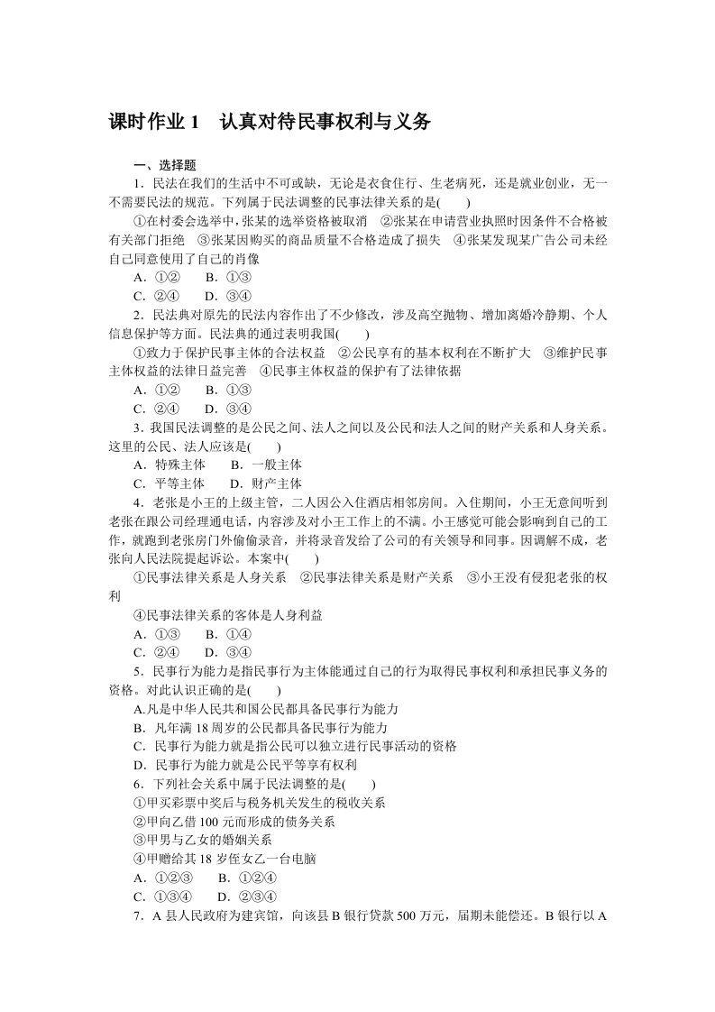 学生啦:课时作业1认真对待民事权利与义务一、选择题1.民法在我们的生活中不可或缺,无论是衣食住行、生老病死,还是就业创业,无一不需要民法的规范。下列属于民法调整的民事法律关系的是()①在村委会选举中,张某的选举资格被取消②张某在申请营业执照时因条件不合格被有关部门拒绝③张某因购买的商品质量不合格造成了损失④张某发现某广告公司未经自己同意使用了自己的肖像A.①②B.①③C.②④D.③④2.民法典对原先的民法内容作出了不少修改,涉及高空抛物、增加离婚冷静期、个人信息保护等方面。民法典的通过表明我国()①致力于保护民事主体的合法权益②公民享有的基本权利在不断扩大③维护民事主体权益的法律日益完善④民事主体权益的保护有了法律依据A.①②B.①③C.②④D.③④3.我国民法调整的是公民之间、法人之间以及公民和法人之间的财产关系和人身关系。这里的公民、法人应该是()A.特殊主体B.一般主体C.平等主体D.财产主体4.老张是小王的上级主管,二人因公入住酒店相邻房间。入住期间,小王无意间听到老张在跟公司经理通电话,内容涉及对小王工作上的不满。小王感觉可能会影响到自己的工作,就跑到老张房门外偷偷录音,并将录音发给了公司的有关领导和同事。因调解不成,老张向人民法院提起诉讼。本案中()①民事法律关系是人身关系②民事法律关系是财产关系③小王没有侵犯老张的权利④民事法律关系的客体是人身利益A.①③B.①④C.②④D.③④5.民事行为能力是指民事行为主体能通过自己的行为取得民事权利和承担民事义务的资格。对此认识正确的是()A.凡是中华人民共和国公民都具备民事行为能力B.凡年满18周岁的公民都具备民事行为能力C.民事行为能力就是指公民可以独立进行民事活动的资格D.民事行为能力就是公民平等享有权利6.下列社会关系中属于民法调整的是()①甲买彩票中奖后与税务机关发生的税收关系②甲向乙借100元而形成的债务关系③甲男与乙女的婚姻关系④甲赠给其18岁侄女乙一台电脑A.①②③B.①②④C.①③④D.②③④7.A县人民政府为建宾馆,向该县B银行贷款500万元,届期未能偿还。B银行以A