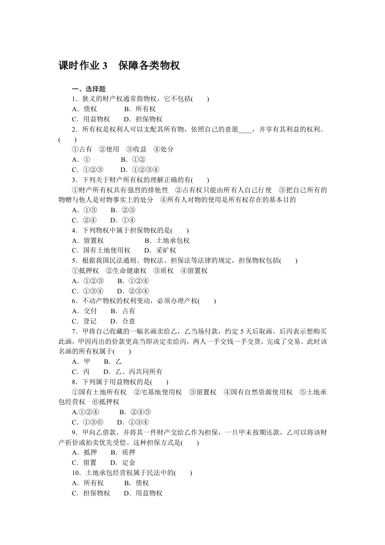 学生啦:课时作业3保障各类物权一、选择题1.狭义的财产权通常指物权,它不包括()A.债权B.所有权C.用益物权D.担保物权2.所有权是权利人可以支配其所有物,依照自己的意愿,并享有其利益的权利。①占有②使用③收益④处分A.①B.①X②C.①②③3.下列关于财产所有权的理解正确的有()①财产所有权具有强烈的排他性②占有权只能由所有人自己行使③把自己所有的物赠与他人是对物事实上的处分④所有人对物的使用是所有权存在的基本目的A.①③B.②③C.②④D.①④4.下列物权中属于担保物权的是()A.留置权B.土地承包权C.国有土地使用权D.采矿权5.根据我国民法通则、物权法、担保法等法律的规定,担保物权包括()①抵押权②生命健康权③质权④留置权A.①②③B.①X②④C.①③④D.②③④6.不动产物权的权利变动,必须办理产权(A.交付B.占有C.登记D.合意7.甲将自己收藏的一幅名画卖给乙,乙当场付款,约定5天后取画。后丙表示想购买此画,甲因丙出的价款更高当即决定卖给丙,两人一手交钱一手交货,完成了交易。此时该名画的所有权属于()A.甲B.乙C.丙D.乙、丙共同所有8.下列属于用益物权的是()①国有土地所有权②宅基地使用权③留置权④国有自然资源使用权⑤土地承包经营权⑥抵押权A.①②④B.②④⑤C.①③⑥D.①③④9.甲向乙借款,并将其一件财产交给乙作为担保,一旦甲未按期还款,乙可以将该财产折价或拍卖优先受偿。这种担保方式是()A.抵押B.质押C.留置D.定金10.土地承包经营权属于民法中的()A.所有权B.债权C.担保物权D.用益物权