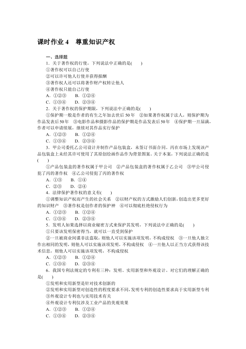 学生啦:课时作业4尊重知识产权一、选择题1.关于著作权的行使,下列说法中正确的是(①著作权可以自己行使②可以许可他人行使并获得报酬③著作权人还可以将著作财产权转让他人④著作权只能自己行使A.①②③C.①③④D.②③④2.关于著作权的保护期限,下列说法中正确的是()①保护期一般是作者的有生之年加去世后50年②如果著作权属于法人,则保护期为作品发表后50年③电影作品和摄影作品的保护期是作品发表后50年④保护期一旦届满,作者可以申请续展,继续对其作品实行保护A.①②③B.①②④C.①③④3.甲公司委托乙公司设计并制作产品包装盒,未签订书面合同。丙在市场上发现该产品包装盒上未经其许可使用了其原创绘画作品作为背景图案。关于本案,下列说法正确的是①产品包装盒的著作权属于甲公司②产品包装盒的著作权属于乙公司③甲公司侵犯了丙的著作权④乙公司侵犯了丙的著作权A.①③B.①④C.②③D.②④4.法律保护著作权的意义有()①调整知识产权而产生的社会关系②以财产权的方式激励人们创新,创造出更多更好的知识财产③著作权是创作者的保护神④可以彻底杜绝侵权行为A.①②③B.①②④C.①③④D.②③④5.发明人如果选择以商业秘密方式来保护其发明,下列说法中正确的是()①只要该发明保密得当,就可以一直受到保护②一旦被商业间谍非法盗取,则他人可以实施该项发明,不构成侵权③一旦他人独立作出相同的发明,则他人可以实施该项发明,不构成侵权④一旦他人以正当方式获得该技术信息,则他人可以实施该项发明,不构成侵权A.①②③B.①②④D.②③④6.我国专利法规定的专利有三种:发明、实用新型和外观设计。对它们的理解正确的是()①发明和实用新型是针对技术创新的②发明和实用新型对创造性的程度要求不同,发明专利的创造性要求高于实用新型专利③外观设计专利也与实用技术有关④外观设计专利仅涉及工业产品的美观效果A.①②③B.①②④C.①③④D.②③④