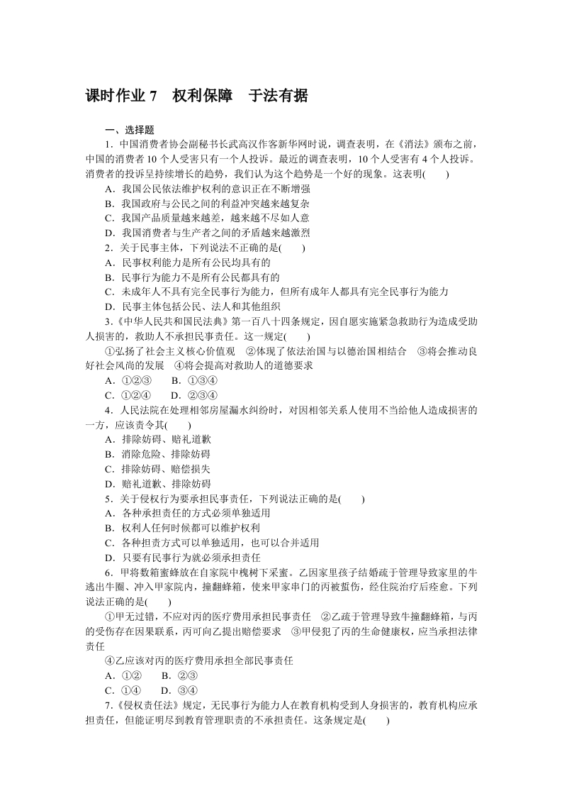学生啦:课时作业7权利保障于法有据一、选择题1.中国消费者协会副秘书长武高汉作客新华网时说,调查表明,在《消法》颁布之前,中国的消费者10个人受害只有一个人投诉。最近的调查表明,10个人受害有4个人投诉。消费者的投诉呈持续增长的趋势,我们认为这个趋势是一个好的现象。这表明()A.我国公民依法维护权利的意识正在不断增强B.我国政府与公民之间的利益冲突越来越复杂C.我国产品质量越来越差,越来越不尽如人意D.我国消费者与生产者之间的矛盾越来越激烈2.关于民事主体,下列说法不正确的是(A,民事权利能力是所有公民均具有的B.民事行为能力不是所有公民都具有的C.未成年人不具有完全民事行为能力,但所有成年人都具有完全民事行为能力D.民事主体包括公民、法人和其他组织3.《中华人民共和国民法典》第一百八十四条规定,因自愿实施紧急救助行为造成受助人损害的,救助人不承担民事责任。这一规定(①弘扬了社会主义核心价值观②体现了依法治国与以德治国相结合③将会推动良好社会风尚的发展④将会提高对救助人的道德要求A.①②③B.①③④C.①②④D.②③④4.人民法院在处理相邻房屋漏水纠纷时,对因相邻关系人使用不当给他人造成损害的一方,应该责令其(A,排除妨碍、赔礼道歉B.消除危险、排除妨碍C.排除妨碍、赔偿损失D.赔礼道款、排除妨碍5.关于侵权行为要承担民事责任,下列说法正确的是()A,各种承担责任的方式必须单独适用B.权利人任何时候都可以维护权利C.各种担责方式可以单独适用,也可以合并适用D.只要有民事行为就必须承担责任6.甲将数箱蜜蜂放在自家院中槐树下采蜜。乙因家里孩子结婚疏于管理导致家里的牛逃出牛圈、冲入甲家院内,撞翻蜂箱,使来甲家串门的丙被蜇伤,经住院治疗后痊愈。下列说法正确的是()①甲无过错,不应对丙的医疗费用承担民事责任②乙疏于管理导致牛撞翻蜂箱,与丙的受伤存在因果联系,丙可向乙提出赔偿要求③甲侵犯了丙的生命健康权,应当承担法律责任④乙应该对丙的医疗费用承担全部民事责任A.①②B.②③C.①④D.③④7.《侵权责任法》规定,无民事行为能力人在教育机构受到人身损害的,教育机构应承担责任,但能证明尽到教育管理职责的不承担责任。这条规定是()