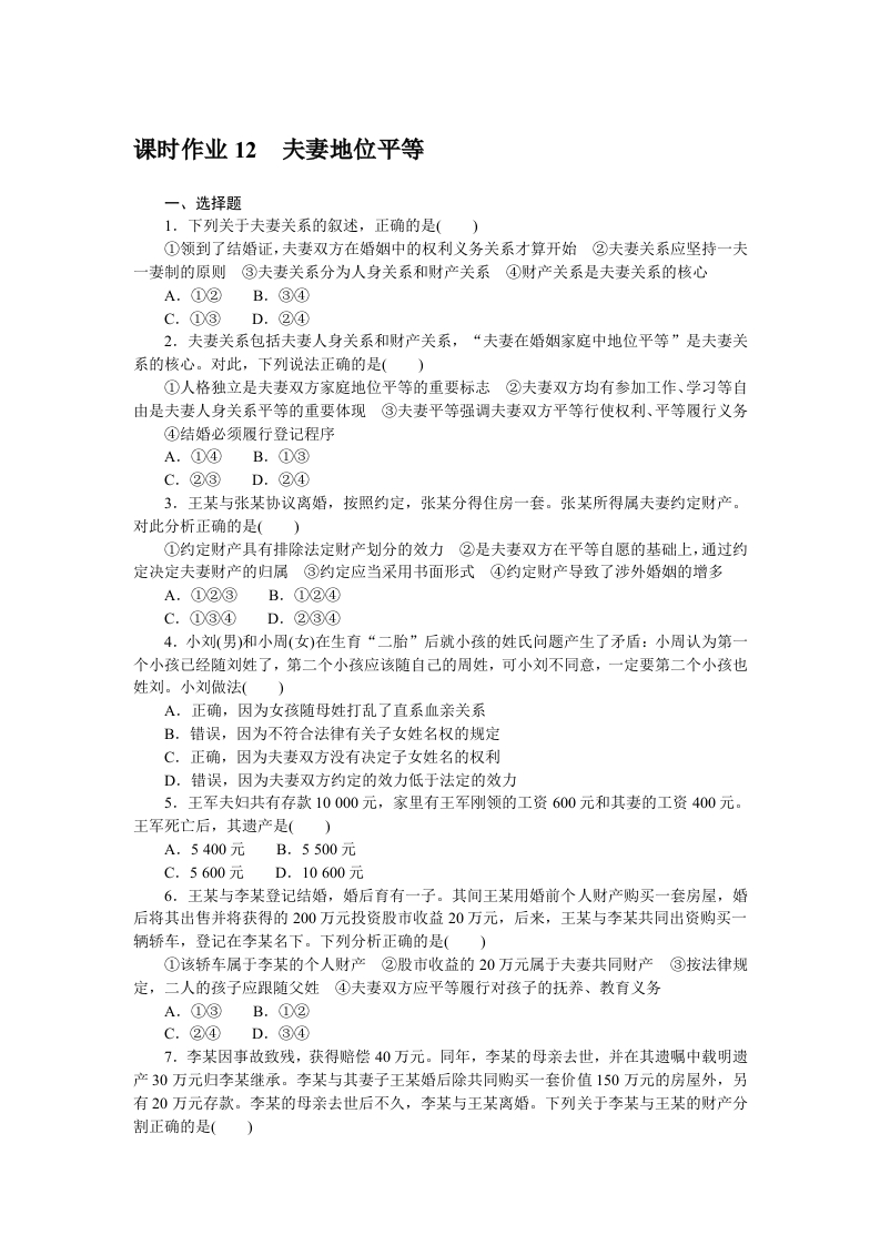 学生啦:课时作业12夫妻地位平等一、选择题1.下列关于夫妻关系的叙述,正确的是()①领到了结婚证,夫妻双方在婚姻中的权利义务关系才算开始②夫妻关系应坚持一夫一妻制的原则③夫妻关系分为人身关系和财产关系④财产关系是夫妻关系的核心A.①②B.③④C.①③D.②④2.夫妻关系包括夫妻人身关系和财产关系,“夫妻在婚姻家庭中地位平等”是夫妻关系的核心。对此,下列说法正确的是()①人格独立是夫妻双方家庭地位平等的重要标志②夫妻双方均有参加工作、学习等自由是夫妻人身关系平等的重要体现③夫妻平等强调夫妻双方平等行使权利、平等履行义务④结婚必须履行登记程序A.①④B.①③C.②③D.②43.王某与张某协议离婚,按照约定,张某分得住房一套。张某所得属夫妻约定财产。对此分析正确的是()①约定财产具有排除法定财产划分的效力②是夫妻双方在平等自愿的基础上,通过约定决定夫妻财产的归属③约定应当采用书面形式④约定财产导致了涉外婚姻的增多A.①②③B.①②④C.①③④D.②③④4.小刘(男)和小周(女)在生育“二胎”后就小孩的姓氏问题产生了矛盾:小周认为第一个小孩已经随刘姓了,第二个小孩应该随自己的周姓,可小刘不同意,一定要第二个小孩也姓刘。小刘做法()A.正确,因为女孩随母姓打乱了直系血亲关系B.错误,因为不符合法律有关子女姓名权的规定C.正确,因为夫妻双方没有决定子女姓名的权利D.错误,因为夫妻双方约定的效力低于法定的效力5.王军夫妇共有存款10000元,家里有王军刚领的工资600元和其妻的工资400元。王军死亡后,其遗产是()A.5400元B.5500元C.5600元D.10600元6.王某与李某登记结婚,婚后育有一子。其间王某用婚前个人财产购买一套房屋,婚后将其出售并将获得的200万元投资股市收益20万元,后来,王某与李某共同出资购买一辆轿车,登记在李某名下。下列分析正确的是()①该轿车属于李某的个人财产②股市收益的20万元属于夫妻共同财产③按法律规定,二人的孩子应跟随父姓④夫妻双方应平等履行对孩子的抚养、教育义务A.①③B.①②C.②④D.③④7.李某因事故致残,获得赔偿40万元。同年,李某的母亲去世,并在其遗嘱中载明遗产30万元归李某继承。李某与其妻子王某婚后除共同购买一套价值150万元的房屋外,另有20万元存款。李某的母亲去世后不久,李某与王某离婚。下列关于李某与王某的财产分割正确的是()