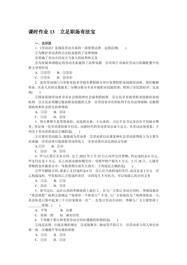 学生啦:课时作业13立足职场有法宝一、选择题1.《劳动法》是规范劳动关系的一部重要法律。这部法律()①为维护劳动者的合法权益提供了法律保障②明确了劳动合同双方当事人的权利和义务③为发展和谐稳定的劳动关系提供了法律依据④有利于市场在劳动力资源配置中发挥主导型作用A.①②③B.①②④C.①③④D.②③④2.某市劳动部门与市职业技术学校在暑假联合举行免费的职业技能培训班。他们根据待业、失业人员的自愿报名,分期分批分专业开展职业技能培训,得到了市民的好评。这说①国家保障劳动者享有社会保险和社会福利的权利②公民享有接受职业技能培训的权利③公民必须履行提高职业技能的义务④劳动者享有的权利不仅有法律保障,还能得到政府和社会的支持和帮助A.①②B.③④C.①③D.②④3.伟大梦想不是等得来的,而是拼出来、干出来的。习近平总书记多次在不同场合赞美、肯定每一位劳动者的艰辛付出,向新时代的劳动者发出奋斗宣言。从劳动法角度看,下列关于劳动者的说法正确的是()①只要有劳动能力,就能成为劳动者②劳动者以从事某种社会劳动获得收入为主要生活来源③劳动者只能获取劳动性收入④劳动者应该达到法定年龄A.①③B.①④C.②③D.②④4.甲与乙签订买卖合同,定于2022年2月25日乙向甲交付货物,约定违约金6万元,甲支付定金3万元。后乙因故未能如期交付,导致甲财产损失5万元。2月28日,乙储存货物的仓库被雷击中,导致货物全部失火消失。下列说法正确的是()①甲可解除合同,要求乙支付违约金6万②乙应当承担违约责任,返还定金3万元③乙构成违约,甲有权向乙主张违约责任④因发生不可抗力,可以免除乙的合同义务A.①②B.①③C.②③D.③④5.春节过后,远在山西的李刚来到上海打工。在与厂方签订劳动合同时,李刚发现在“休息休假”权利方面规定“每周有一个休息日”不妥,与厂方协商改为“每两周休息一天,其余休息日集中起来三个月回家探亲一次”。在签订劳动合同时,李刚与厂方主要坚持了原则。()A.平等B.自愿C.协商一致D.诚实信用6.下列属于签订和变更劳动合同应遵循的原则的是()①违反法律、行政法规的规定②采取欺诈、胁迫等手段订立③劳动者与用人单位协商一致④遵循平等自愿的原则A.①③B.③④C.①④D.①②