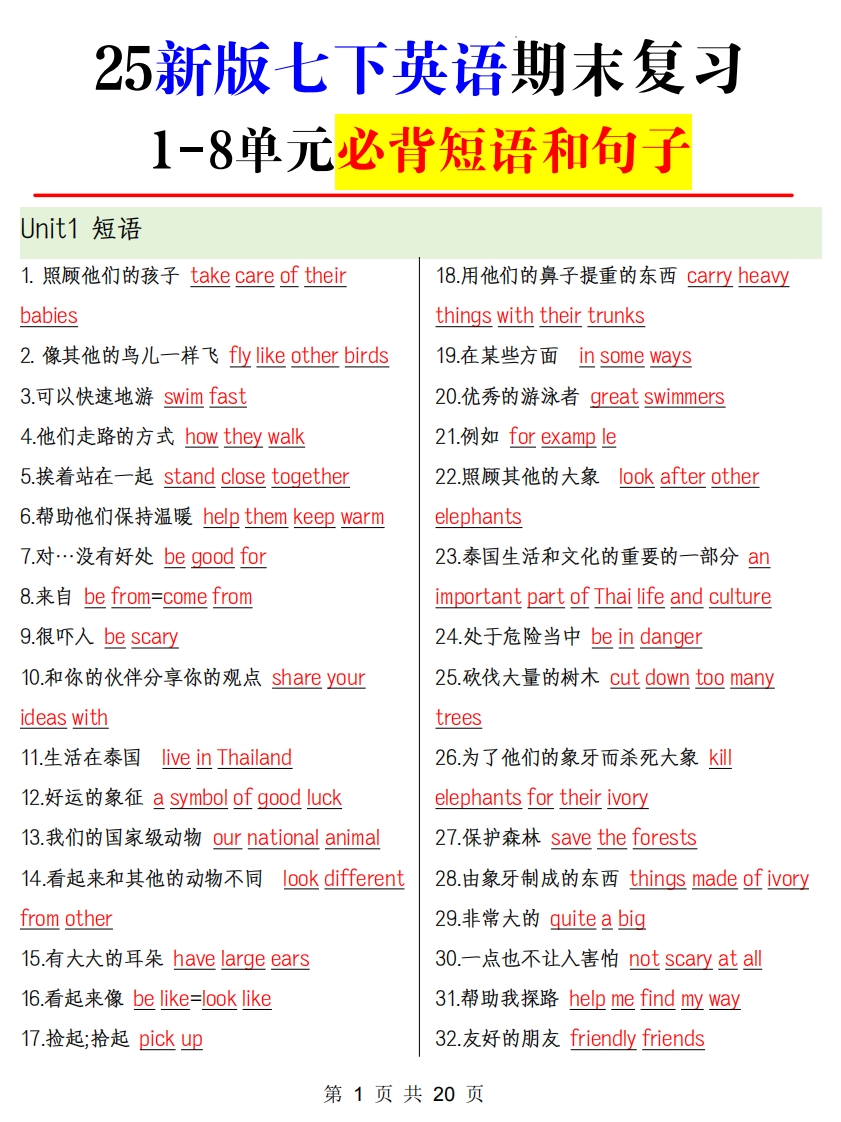 学生啦:25新版七下英语期末复习1-8单元必背短语和句子Unit1短语1.照顾他们的孩子take care of their18.用他们的鼻子提重的东西carry heavybabiesthings with their trunks2.像其他的鸟儿一样飞fly like other birds19.在某些方面in some ways3.可以快速地游swim fast20.优秀的游泳者great swimmers4.他们走路的方式how they walk21.例如for examp le5.挨着站在一起stand close together22.照顾其他的大象look after other6.帮助他们保持温暖help them keep warmelephants7.对…没有好处be good for23.泰国生活和文化的重要的一部分an8.来自be from=come fromimportant part of Thai life and culture9.很吓入be scary24.处于危险当中be in danger10.和你的伙伴分享你的观点share your25.砍伐大量的树木cut down to0manyideas withtrees11.生活在泰国live in Thailand26.为了他们的象牙而杀死大象ki12.好运的象征a symbol of good luckelephants for their ivory13.我们的国家级动物our national animal27.保护森林save the forests14.看起来和其他的动物不同look different28.由象牙制成的东西things made of ivoryfrom other29.非常大的quite a big15.有大大的耳朵have large ears30.一点也不让入害怕not scary at all16.看起来像be like=look like31.帮助我探路help me find my way17.捡起;拾起pick up32.友好的朋友friendly friends第1页共20页