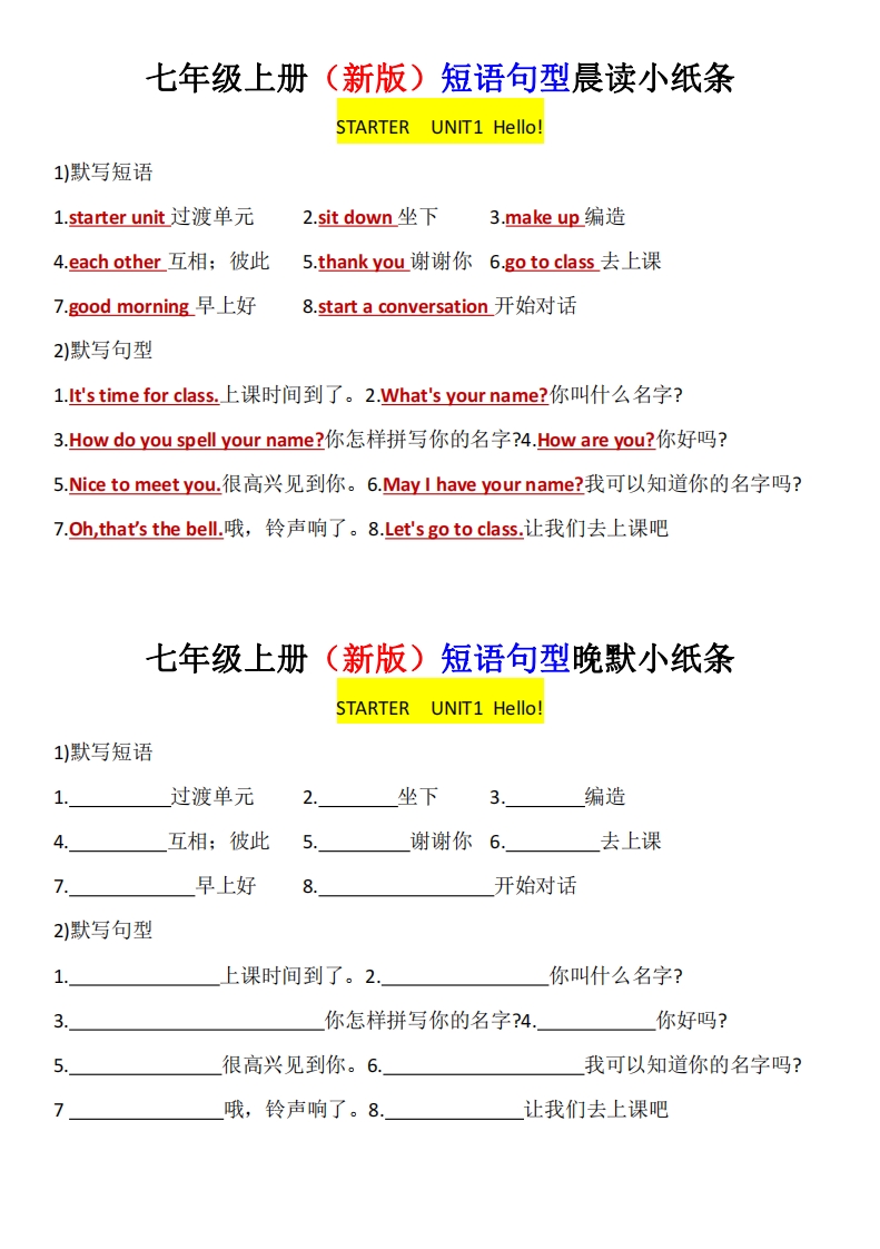 学生啦:七年级上册(新版)短语句型晨读小纸条STARTER UNIT1 Hello!1)默写短语1.starter unit过渡单元2.sit down坐下3.make up编造4.each other互相;彼此5.thank you谢谢你6.go to clas5去上课7.good morning早上好8.start a conversation开始对话2)默写句型1.t's time for class..上课时间到了。2.What's your name2你叫什么名字?3.How do you spell your name?你怎样拼写你的名字?4.How are you2你好吗?5.Nice to meet you.很高兴见到你。6.May I have your name?我可以知道你的名字吗?7.Oh,that's the bell.哦,铃声响了。8.Let's go to class.让我们去上课吧七年级上册(新版)短语句型晚默小纸条STARTER UNIT1 Hello!1)默写短语过渡单元2坐下3编造互相;彼此谢谢你6.去上课7.早上好开始对话2)默写句型上课时间到了。2.你叫什么名字?你怎样拼写你的名字?4你好吗?很高兴见到你。6.我可以知道你的名字吗?哦,铃声响了。8让我们去上课吧