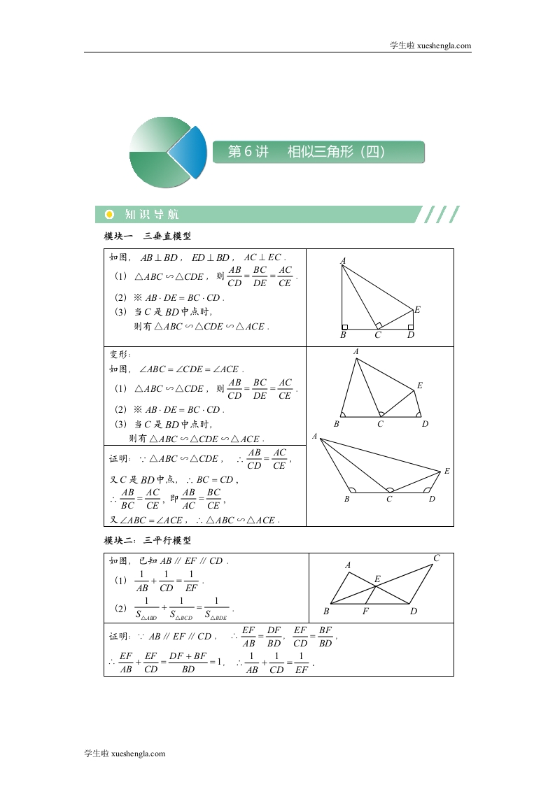 学生啦:学生啦xueshengla.com第6讲相似三角形(四)模块一三垂直模型如图,AB⊥BD,ED⊥BD,AC⊥EC.(1)△ABC∽△CDE,CD DE CE(2)※AB·DE=BC·CD.(3)当C是BD中点时,则有△ABC∽△CDE∽△ACE.变形:如图,∠ABC=∠CDE=∠ACE(2)※AB·DE=BC·CD(3)当C是BD中点时,则有△ABC∽△CDE∽△ACE证明:△ABC∽△CDE,CD CE'叉C是BD中点,.BC=CD,AB_ACCAC CE'又∠ABC=∠ACE,.△ABC∽△ACE.模块二:三平行模型如图,已知AB /EF∥CDA(1)111AB CD EF111(2)B:AB∥EF∥CD,AB BD'CD BDEFEF DF+BF111AB CDBDAB CD EF学生啦xueshengla.com