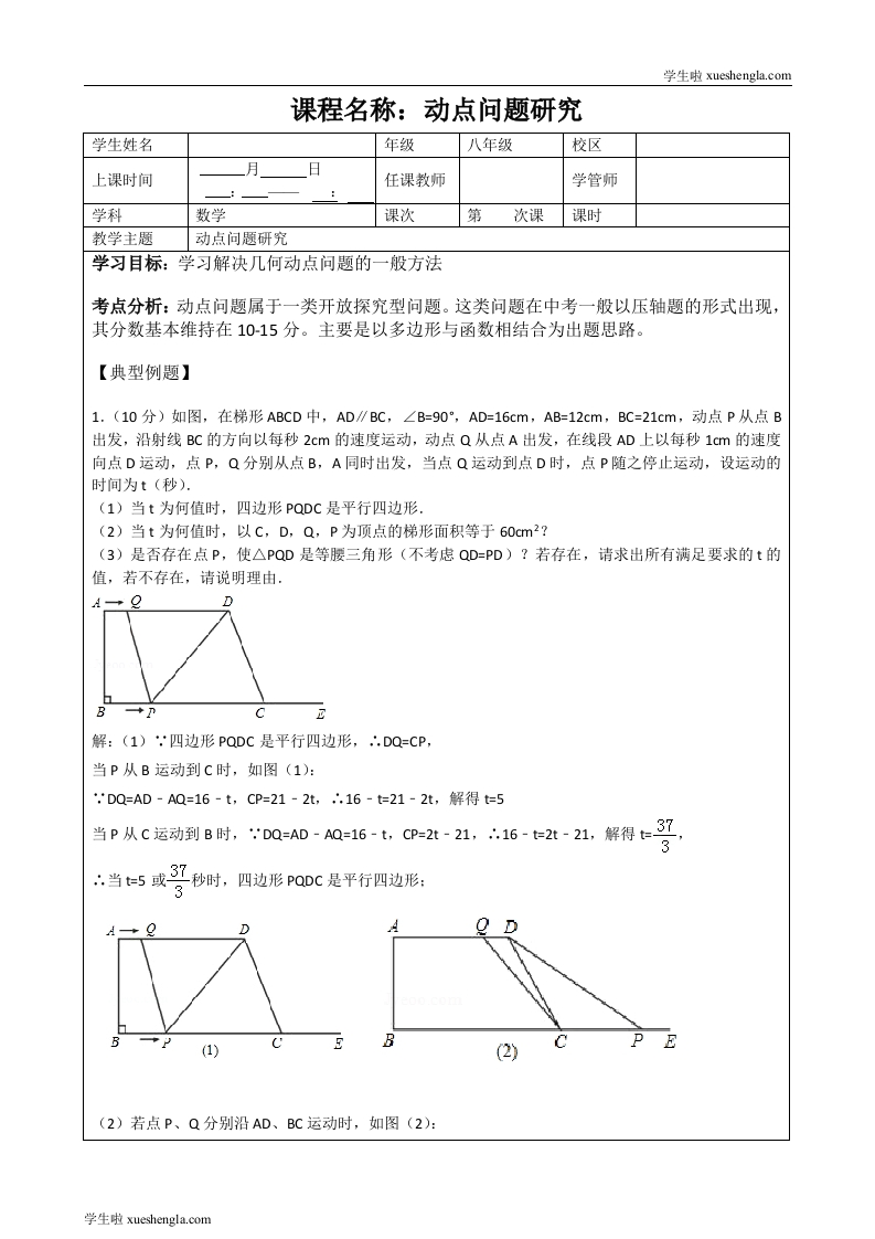 学生啦:学生啦xueshengla.com课程名称:动点问题研究学生姓名年级八年级校区月日上课时间任课教师学管师学科数学课次第次课课时教学主题动点问题研究学习目标:学习解决几何动点问题的一般方法考点分析:动点问题属于一类开放探究型问题。这类问题在中考一般以压轴题的形式出现,其分数基本维持在1015分。主要是以多边形与函数相结合为出题思路。【典型例题】1.(10分)如图,在梯形ABCD中,AD∥BC,∠B=90°,AD=16cm,AB=12cm,BC=21cm,动点P从点B出发,沿射线BC的方向以每秒2cm的速度运动,动点Q从点A出发,在线段AD上以每秒1cm的速度向点D运动,点P,Q分别从点B,A同时出发,当点Q运动到点D时,点P随之停止运动,设运动的时间为t(秒).(1)当t为何值时,四边形PQDC是平行四边形.(2)当t为何值时,以C,D,Q,P为顶点的梯形面积等于60cm2?(3)是否存在点P,使△PQD是等腰三角形(不考虑QD=PD)?若存在,请求出所有满足要求的t的值,若不存在,请说明理由.B解:(1)四边形PQDC是平行四边形,∴,DQ=CP,当P从B运动到C时,如图(1):,DQ=AD-AQ=16-t,CP=21-2t,.16-t=21-2t,解得t=53-0(1)CE(2)若点P、Q分别沿AD、BC运动时,如图(2):学生啦xueshengla.com