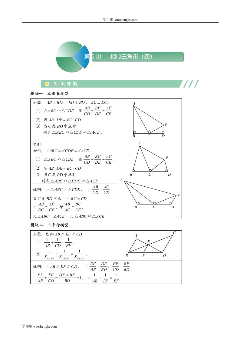 学生啦:学生啦xueshengla.com相似三角形(四)模块一三垂直模型如图,AB⊥BD,ED⊥BD,AC⊥EC.(1)△ABC△CDE,CD DE CE(2)※AB·DE=BC·CD(3)当C是BD中点时,则有△ABC∽△CDE∽△ACE变形:∠ABC=∠CDE=∠ACE(I)△ABC∽△CDE,CD DE CE(2)※AB·DE=BC·CD(3)当C是BD中点时,则有△ABC∽△CDE∽△ACE证明:△ABC∽△CDE,AB ACCD CE'E又C是BD中点,,BC=CD,AB AC=CDAC CE又∠ABC=∠ACE,.△ABC∽△ACE模块二:三平行模型如图,已知AB//EF∥CDy111(1)EAB CD EF111LSABDEBD证明:AB∥EF∥CD,EF BFAB BD CD BDEF EF DF+BF111AB CDBDAB CD EF学生啦xueshengla..com