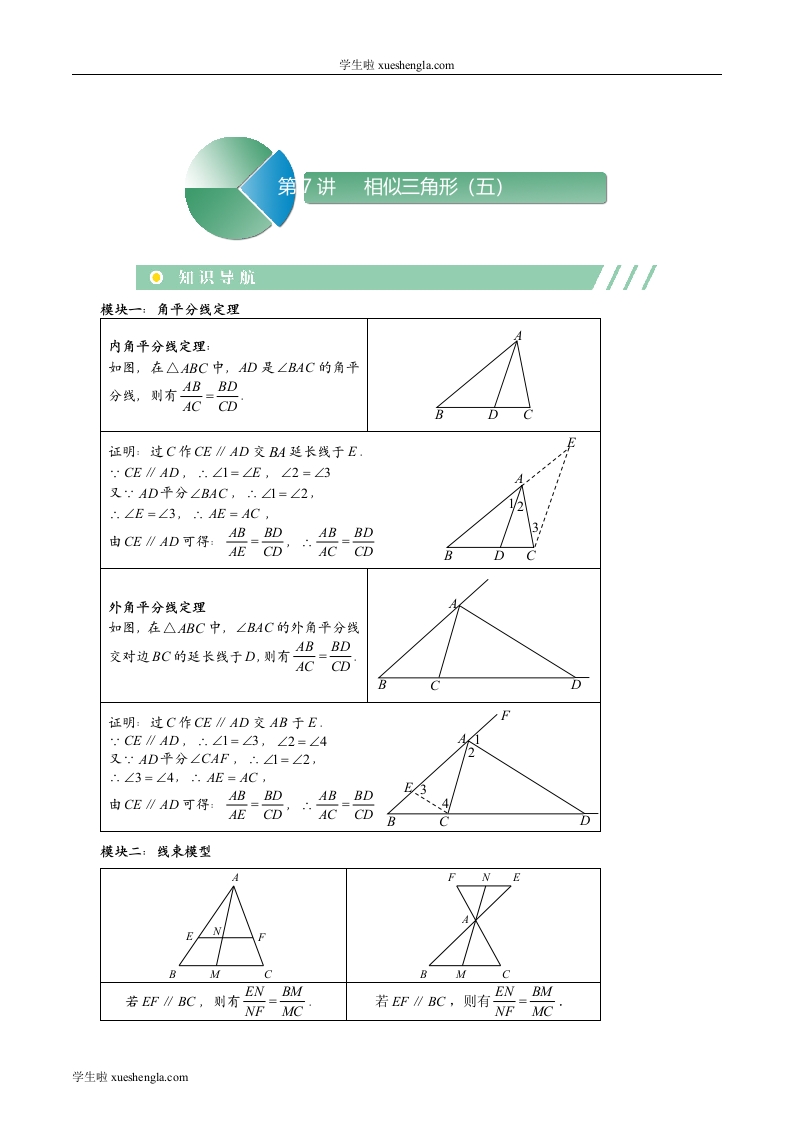 学生啦:学生啦xueshengla.com第7讲相似三角形(五)模块一:角平分线定理内角平分线定理:如图,在△ABC中,AD是∠BAC的角平E证明:过C作CE∥AD交BA延长线于E..CE∥AD,.∠1=∠E,∠2=∠3又AD平分∠BAC,.∠I=∠2,.∠E=∠3,.AE=AC,由CE /AD可得:AB BDAB BDAE CD'ACCD外角平分线定理如图,在△ABC中,∠BAC的外角平分线交对边BC的延长线于D,则有AB BDAC CDBD证明:过C作CE∥AD交AB于E.CE∥AD,.∠1=∠3,∠2=∠4.∠3=∠4,.AE=AC,E3由CE∥AD可得:AB BDAB BDAECDACCDCDBMCBMC若EF∥BC,则有EN BMEN BMNF MC若EF∥BC,则有NF MC学生啦xueshengla.com