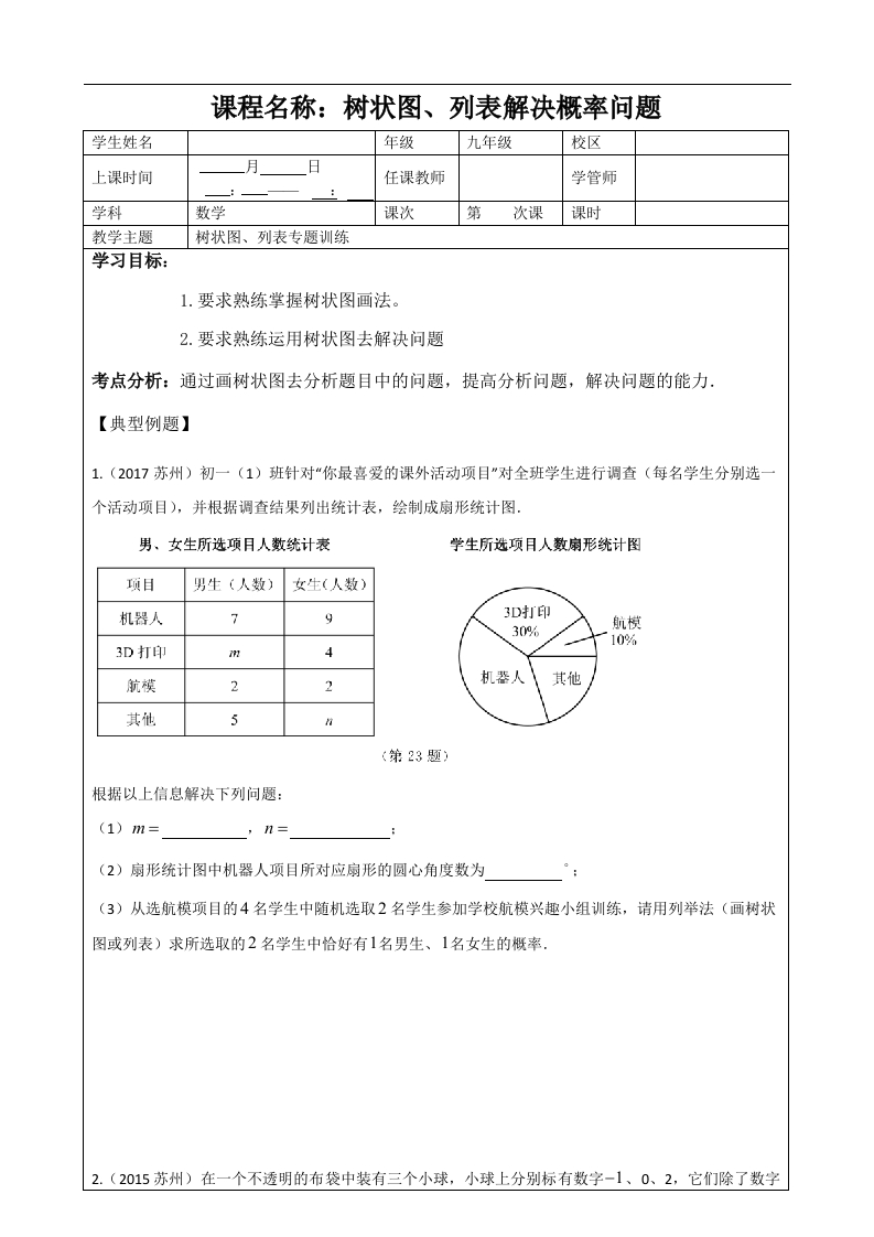 学生啦:课程名称:树状图、列表解决概率问题学生姓名年级九年级校区月上课时间日任课教师学管师学科数学课次第次课课时教学主题树状图、列表专题训练学习目标:1.要求熟练掌握树状图画法。2.要求熟练运用树状图去解决问题考点分析:通过画树状图去分析题目中的问题,提高分析问题,解决问题的能力,【典型例题】1.(2017苏州)初一(1)班针对“你最喜爱的课外活动项目“对全班学生进行调查(每名学生分别选一个活动项目),并根据调查结果列出统计表,绘制成扇形统计图.男、女生所选项月人数统计表学生所选项月人数扇形统计图项目男生(人数)女生(人数)机器人793D打印30%航模10%3D打印航模22其他其他5根据以上信息解决下列问题:(1)m=(2)扇形统计图中机器人项目所对应扇形的圆心角度数为(3)从选航模项目的4名学生中随机选取2名学生参加学校航模兴趣小组训练,请用列举法(画树状图或列表)求所选取的2名学生中恰好有1名男生、1名女生的概率.2.(2015苏州)在一个不透明的布袋中装有三个小球,小球上分别标有数字-1、0、2,它们除了数字