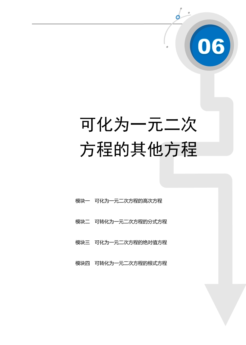 学生啦:06可化为一元二次方程的其他方程模块一可化为一元二次方程的高次方程模块二可转化为一元二次方程的分式方程模块三可化为一元二次方程的绝对值方程模块四可转化为一元二次方程的根式方程