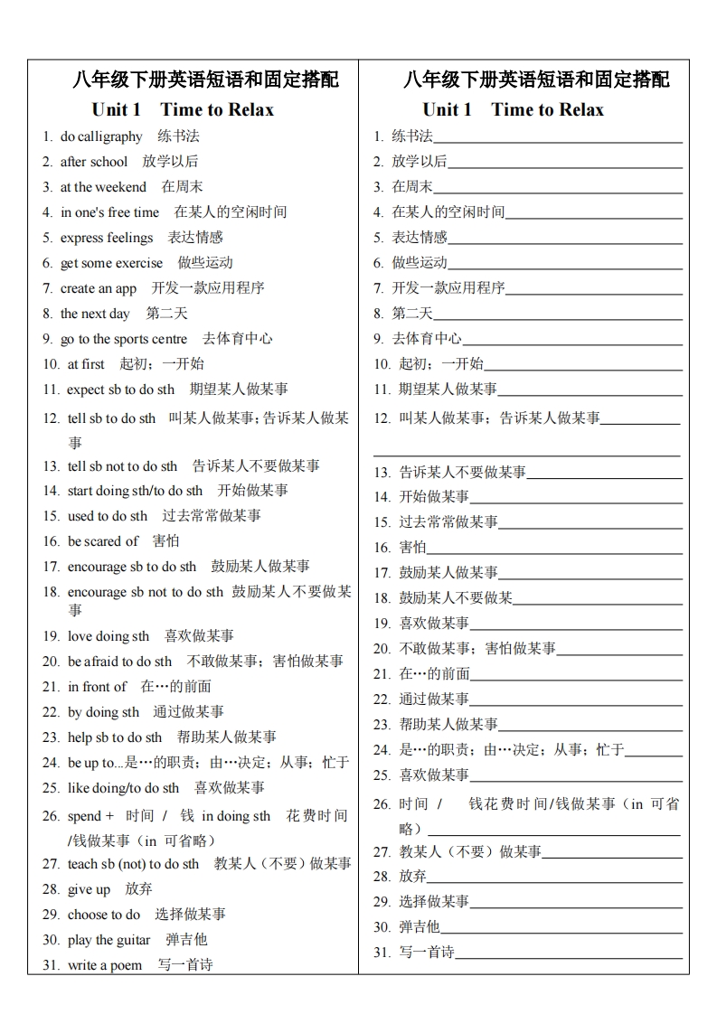 八年级下册英语单词短语与固定搭配u1-u2默写